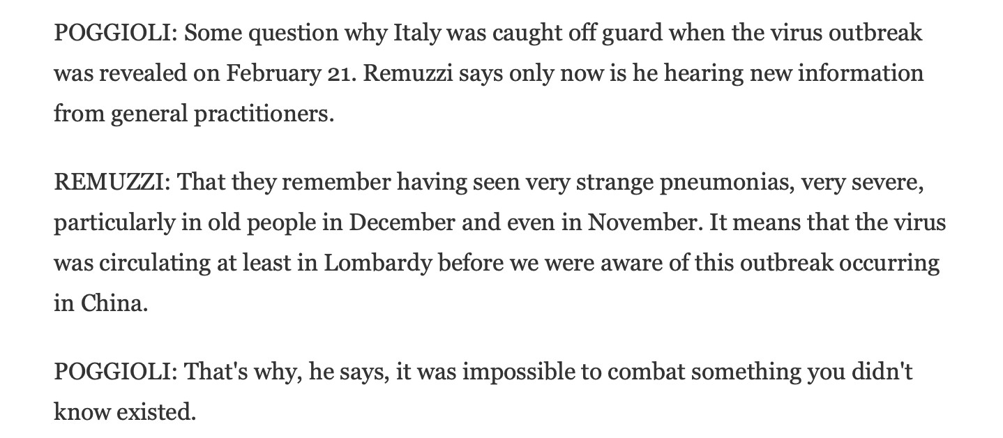 朱塞佩·雷穆齊:他們記得曾遇到過非常奇怪的肺炎,非常嚴重,尤其是12月甚至11月時在老人身上看到過這種肺炎。這意味着,至少在我們意識到疫情在中國暴發前,病毒就已經在倫巴第地區傳播了**。**