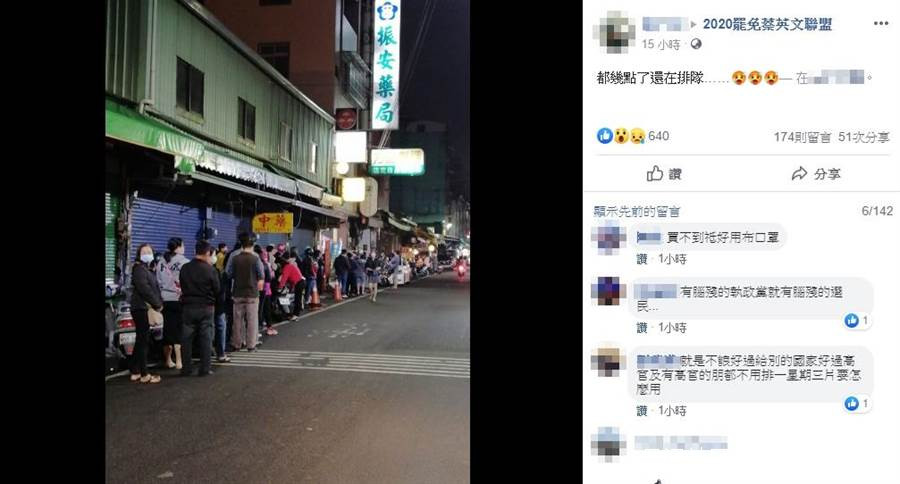 但是網友在臉書上貼出一張圖,表示三更半夜還有民眾在藥店外大排長龍,等着要購買口罩,怒批民進黨當局睜眼説瞎話,不要再自欺欺人了!更痛批民進黨每個星期還送10萬片口罩到美國,根本就是在罔顧台灣民眾的健康!