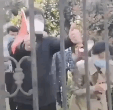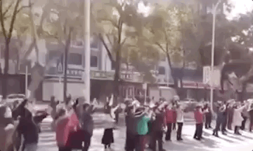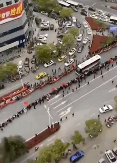 一位市民長跪不起,揮着紅旗,送別英雄。