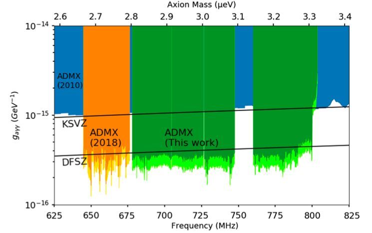 來自ADMX的論文**[1****]排除了軸子質量範圍在2.81-3.31μeV之內的可能性,加上兩年前ADMX已經驗證過的2.66-2.81μeV質量範圍[2****]**,現在已經排除的總體範圍擴大到了2.66-3.31μeV。