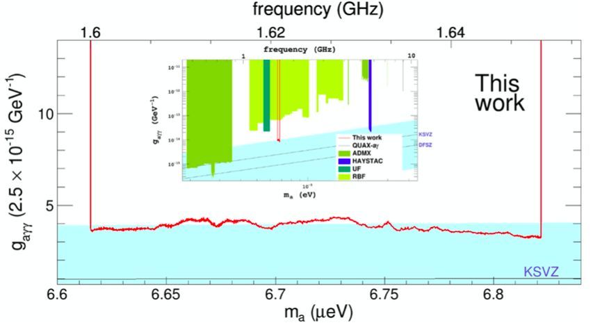 來自韓國CAPP的論文**[3****]**則排除了6.62-6.82μeV這一範圍。有趣的是,CAPP的論文中除了展示自己的成果,還同時將ADMX等其他研究機構先前的成果也一併進行了橫向對比。可惜論文從遞交到發表存在一段時間延遲,所以在CAPP發表於3月13日的論文中,並未包含ADMX剛剛在兩天之前公佈的上述最新成果。