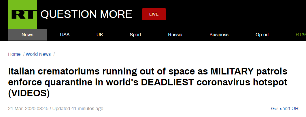 RT報道截圖 意大利北部皮亞琴察省一個火葬場的經理表示,目前該火葬場每天都要收到25具棺材,但是他們只有管理12具棺材的空間。