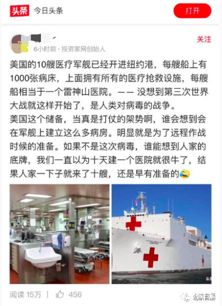 看來,這所謂的“10艘醫療軍艦”,剩下的8艘,都存在這些自媒體的朋友圈和微信羣裏了。
