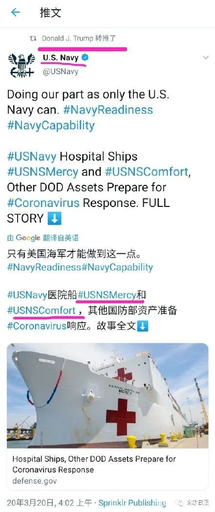 “舒適號”資料圖 3月20日,美國海軍在社交媒體上“蓋章”,證明他們只有2艘醫院船。特朗普還轉推了這條帖子。
