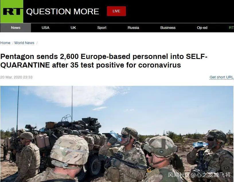 據“今日俄羅斯”(RT)報道,在35名士兵及軍事人員確診感染新冠病毒之後,五角大樓週五(20日)下令讓約2600名駐紮歐洲的美國士兵及軍事人員進行“自我隔離”,以防止新冠病毒傳播。