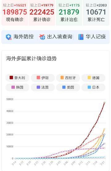 1. 3月22日早海外累計確診22.2萬,增加3.1萬(1.2萬,1.6萬,2.2萬,2.4萬,3.1萬),仍然是日增3萬。