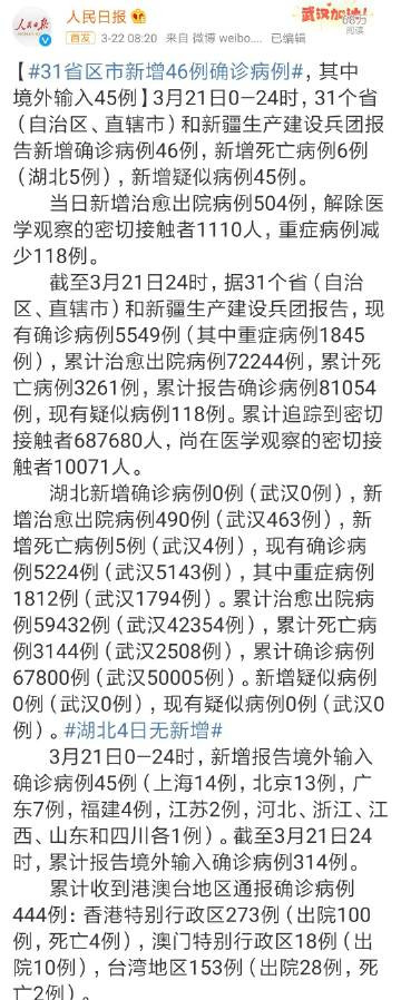 死亡1例,繼續維持低位。外省市死亡率只有武漢五分之一,最大原因是醫療資源充足,病人沒有慌,武漢很多病人是看到醫院擠爆的情況,心理生理受到極大影響,甚至有些可以説是嚇死的。