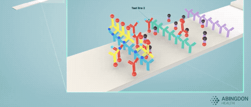 這種原理,就叫做側流免疫層析技術(LFIA)。日本的這種試紙屬於夾心一步法的側流免疫層析技術。夾心法的側流免疫層析技術被廣泛用於血液、乳汁、尿液、血清、植物的汁液以及食品中特定化合物的快速檢測。我們具體來看看它的原理。