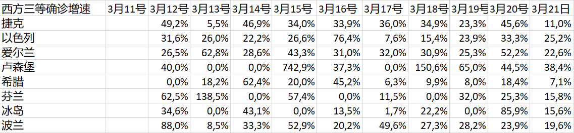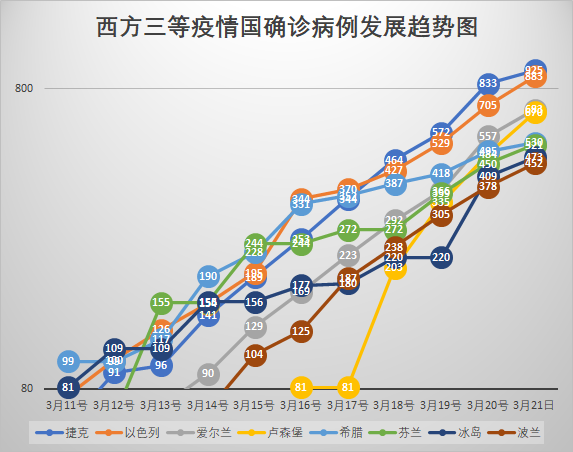 第三撥的八支隊伍態勢和昨天相仿,比第二撥還要整齊。除了希臘,增速都在四五天翻番的水平。捷克的增速驟降,也不正常。看明天會不會漲回來。只有希臘的增速一直較慢。希望它能保持。