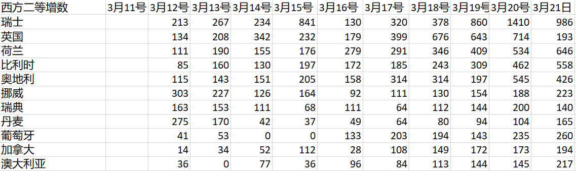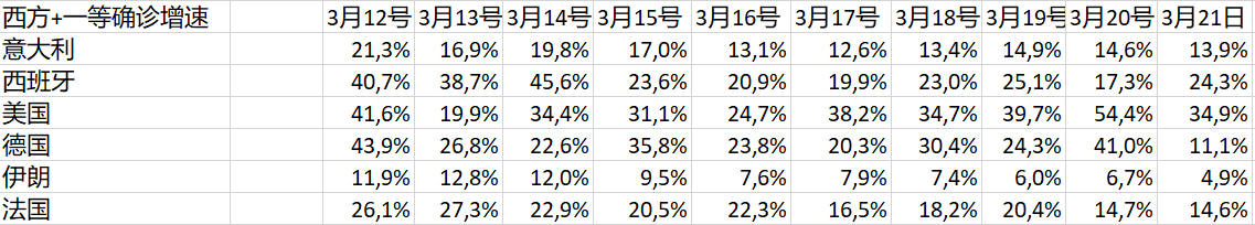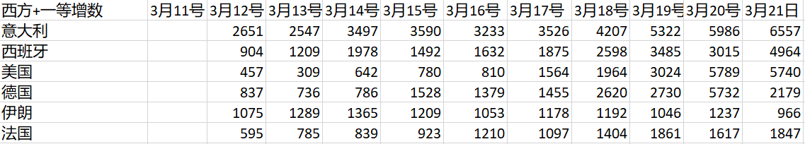 最重要的意大利的新增數今天是6557,又是新高。但增速則有了一點勉強可見的下降。從14.6%降到13.9%。意大利封國至今已經11天,是不是開始看到效果了?如果今後幾天增速能繼續下降,那首先是意大利有希望,然後是歐洲有希望,然後就是整個西方就有希望了。因為上次已經解釋,整個西方是一種文明,相似的地方太多。這不,連生病都十分類似。然後痊癒的方式也會十分類似的。