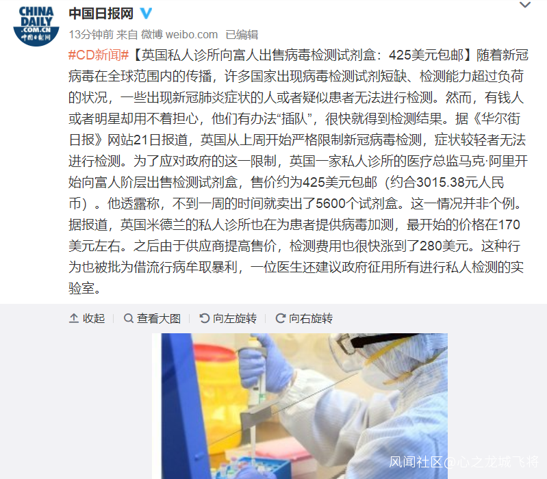 英國私人診所向富人出售病毒檢測試劑盒:425美元包郵_風聞