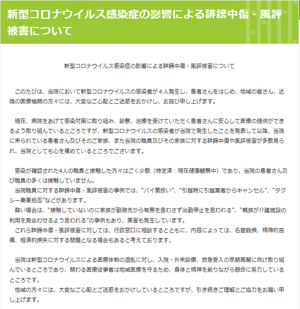 報道稱,北播磨綜合醫療中心在通報中表示,與4名確診醫護人員有過密切接觸的職員非常有限,大多數患者和職員未發生接觸,但已經發生多起針對該院職員的歧視事件,比如被出租車拒載、被搬家公司取消訂單等。部分職員的家人也遭到歧視,有的職員家人在不説明理由的情況下被禁止出勤,有的職員家人被療養院拒收。