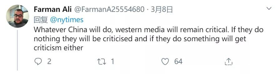 △網友Farman Ali:無論中國做什麼,西方媒體都會進行批駁。如果中國什麼都不做,會被批,如果做了什麼,依然會被批。
