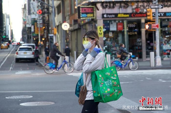 當地時間3月21日,美國紐約時代廣場一位行人防護嚴密。中新社記者 廖攀 攝