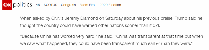 甚至於,CNN的一名記者還在特朗普的發佈會現場專門拿此事質問了特朗普,特朗普只得找補説:“中國當時很透明,但如果他們再早一點透明就好了”。