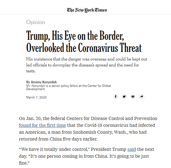 但從《紐約時報》等美國媒體的文章來看,這個病例因為是從武漢回來的,所以沒有引起美國政府的足夠重視。美國政府還在2月很長一段時間裏都堅持認為,病毒來自中國和國外,本土的威脅很小,可防可控。