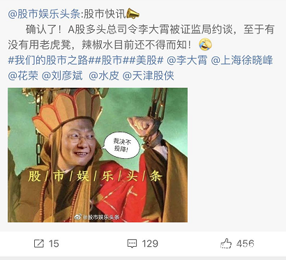 在中國股評屆,像他這樣十年如一日看多的人不多。而且大霄老師的看多,不需要任何理由,任何國家政策和海外變化都可以被他解釋成利好消息。這種話要是我老油條説沒關係,問題在於他是英大證券的首席經濟學家,是個有身份的人。而且最近英大證券借殼上市成功,已經是上市券商了,首席經濟學家在網上天天耍寶實在不像話。