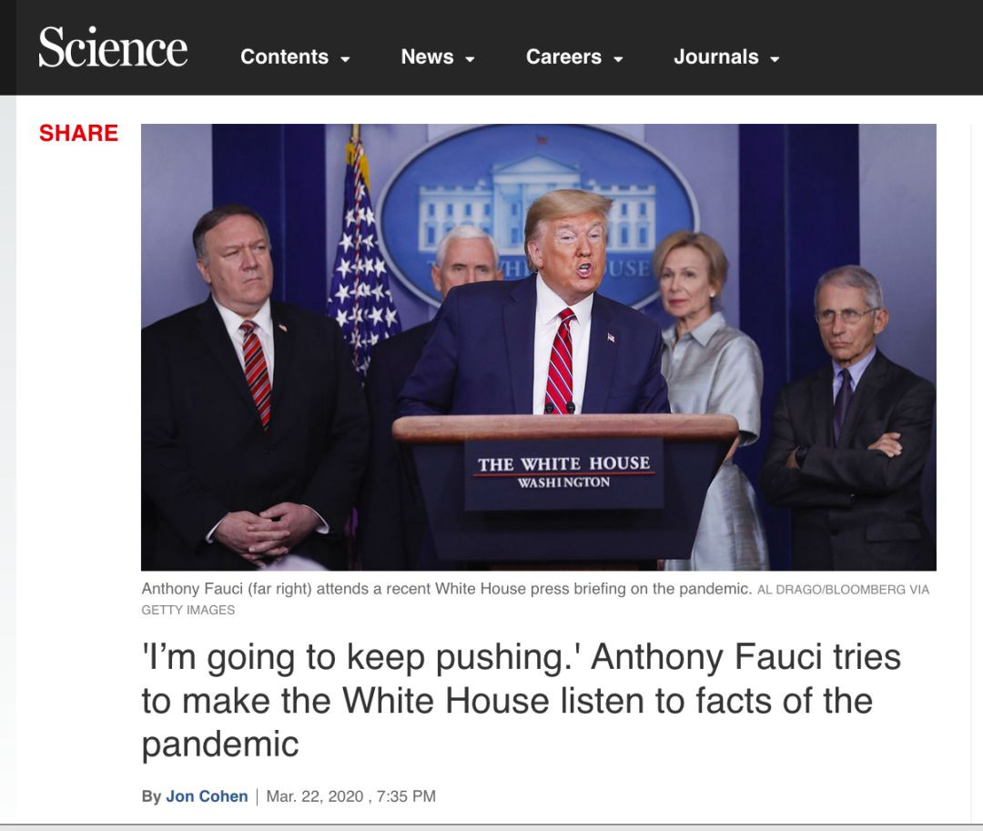 **“我總不能跳到麥克風前面把他推下去。”**當地時間3月22日,美國頂級傳染病專家、國家衞生研究院下屬國家過敏症和傳染病研究所所長安東尼·福奇(Anthony Fauci)接受了《科學》雜誌專訪,而福奇正是借這句話來描述自己對特朗普有關疫情的某些表態無法認同時的“無奈”。