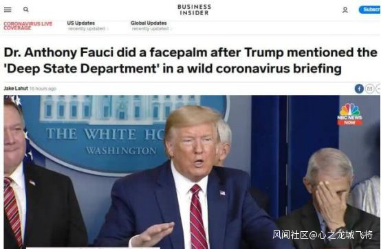 據此前報道,3月20日的白宮疫情簡報會上,特朗普講話説到某個地方時,站在其身旁的福奇似乎偷笑了一下。白宮公佈的簡報會文字實錄顯示,特朗普在回答記者提問時稱,他希望蓬佩奧回到國務院去工作,值得一提的是,特朗普還在進一步解釋中用了“深層國務院”一詞。