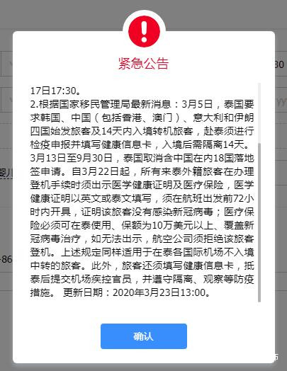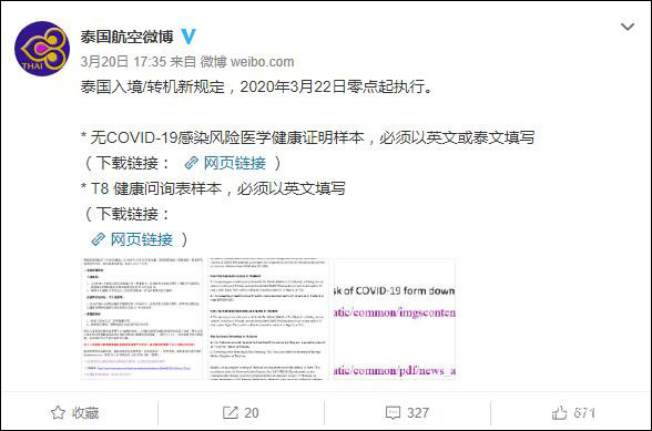 3月5日,泰國要求韓國、中國(包括香港、澳門)、意大利和伊朗四國始發旅客及14天內入境轉機旅客,赴泰須進行檢疫申報並填寫健康信息卡,入境後需隔離14天。