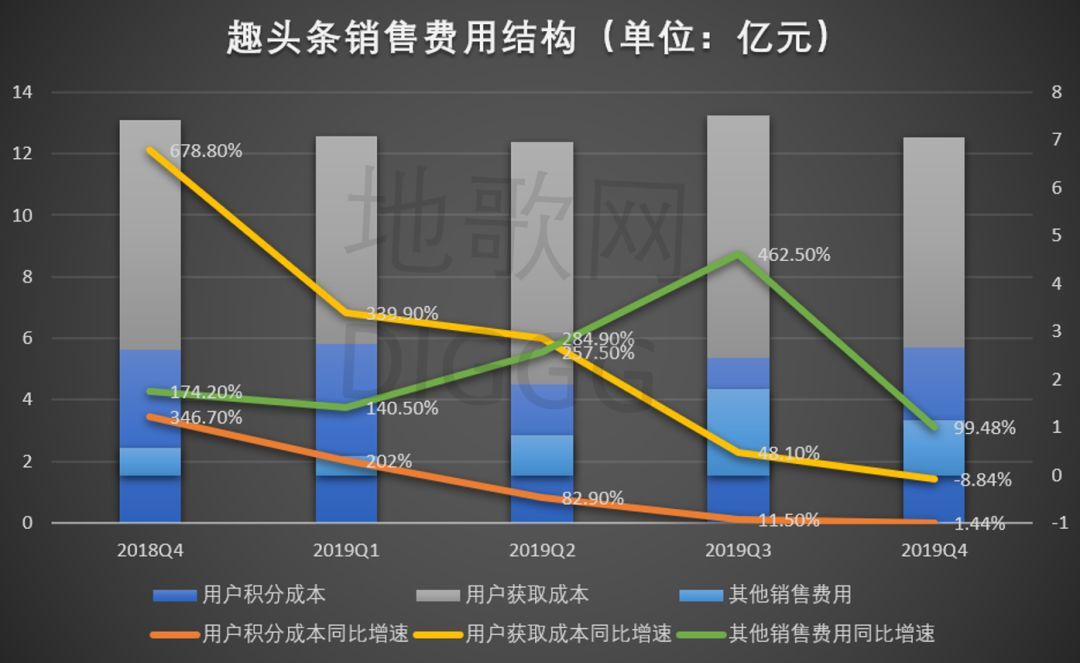 本季度,趣頭條的銷售費用達13.677億元,佔總營收的比重降至82.5%,創下上市以來的最低點,而各項細分費用也大幅減少,其中用户獲取成本僅為6.81億元,同比收窄8.84%。