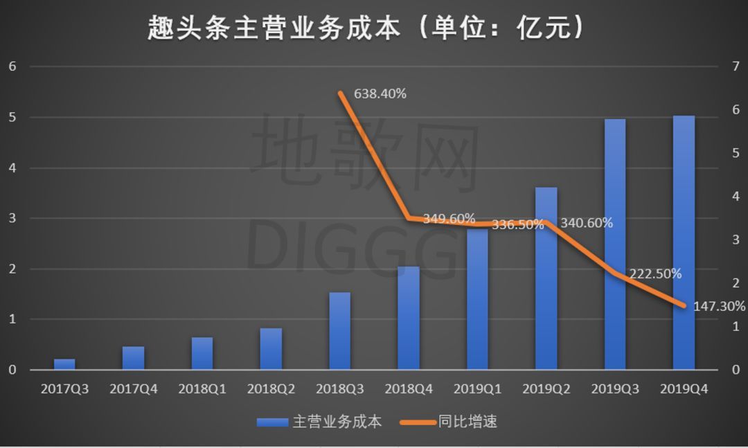 費用下降之際,趣頭條的成本仍穩步增長,其2019Q4的主營業務成本為5.039億元,同比增長147.3%,原因在於內容採購成本、寬帶成本和IT基礎設施成本的增長。