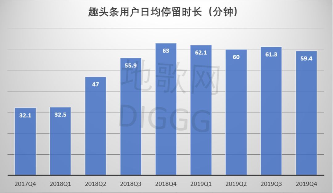 同時,用户在趣頭條上的停留時間也有所下滑。本季度。趣頭條的用户日均停留時間為59.4分鐘,這一數字的增速也在2019年裏持續放緩。