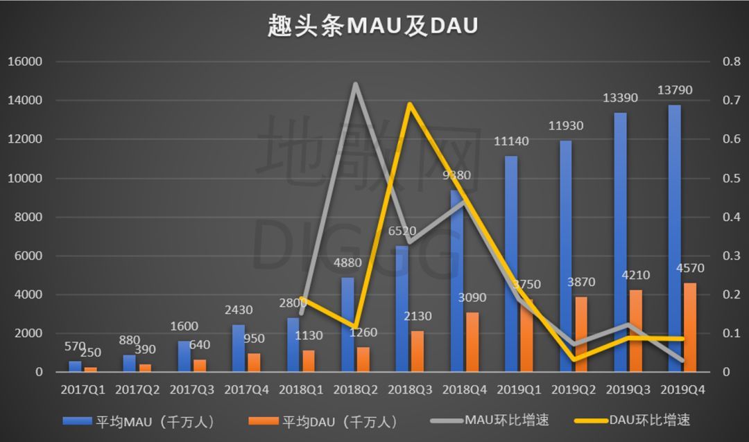 其次,在收入放緩之際,趣頭條的用户增長也走入瓶頸期。本季度,趣頭條月活用户達1.379億,較上一季度淨增長400萬,環比增速僅為3%;日活用户達4570萬,環比增速為8.55%。