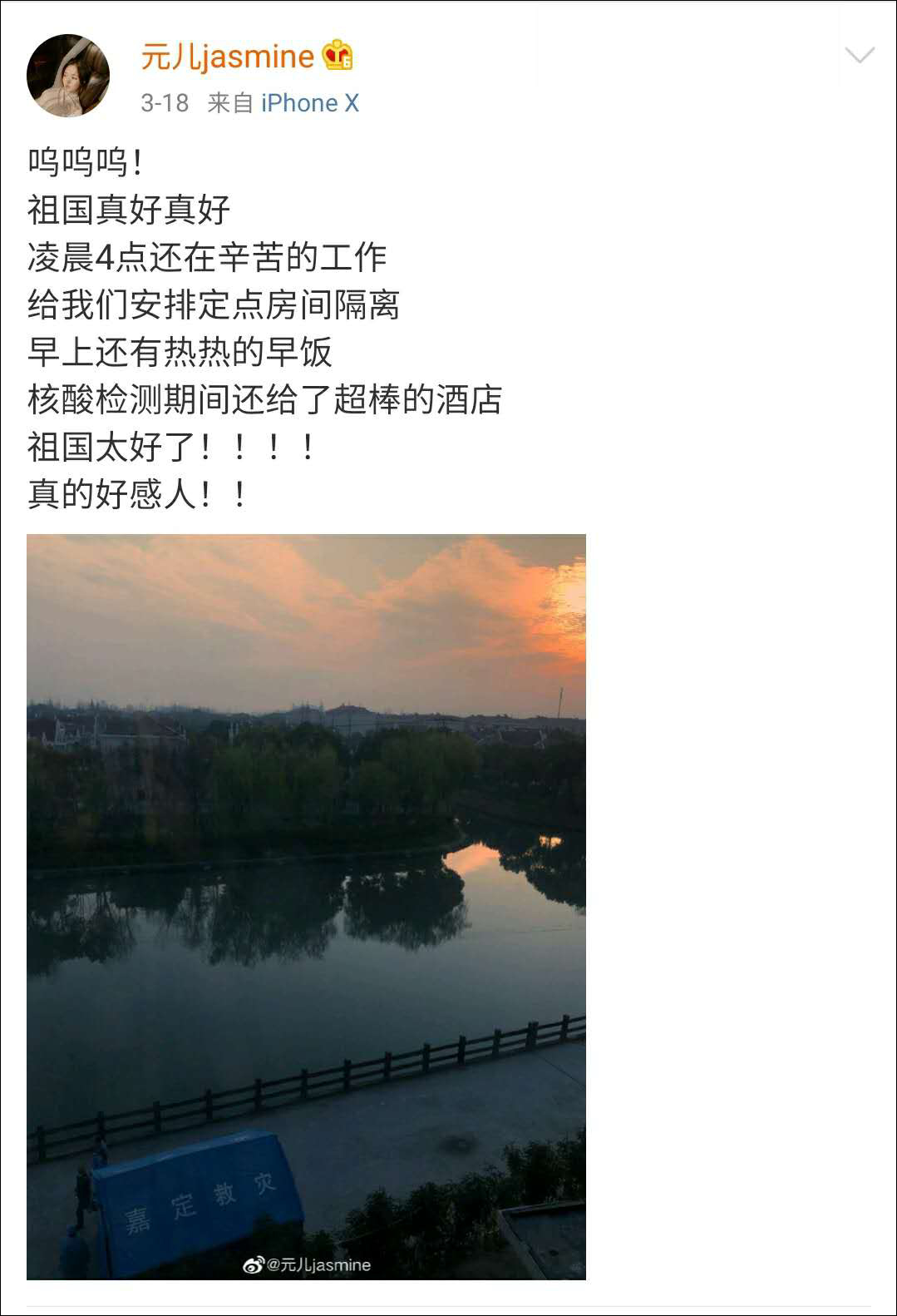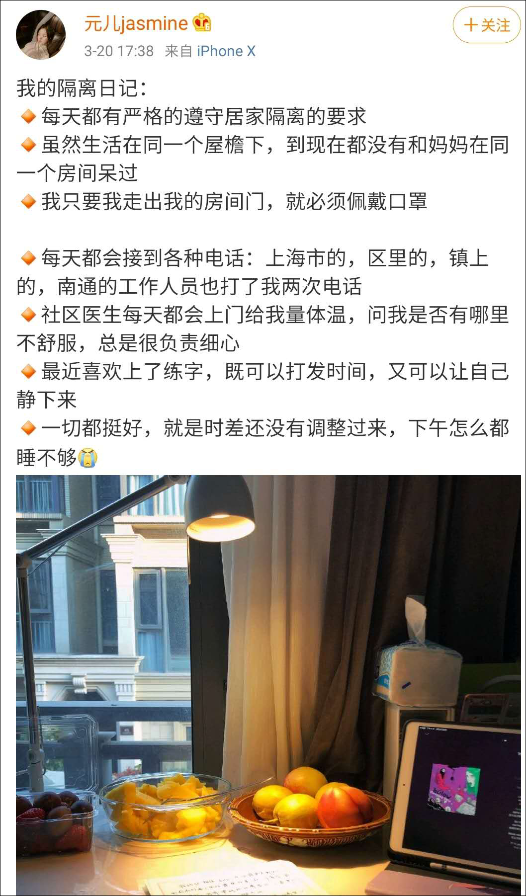 由於核酸檢測呈陰性,@元兒jasmine 已經回到家中隔離。在家裏隔離期間,@元兒jasmine 也是嚴格遵守居家隔離的要求。