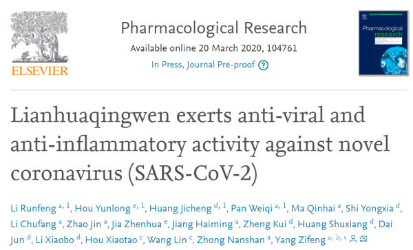 **中國工程院院士鍾南山團隊最新研究認為,連花清瘟在體外試驗中顯示出抗新冠病毒的作用。**相關論文題為《連花清瘟對新型冠狀病毒具有抗病毒、抗炎作用》“Lianhuaqingwen exerts anti-viral and anti-inflammatory activity against novel coronavirus (SARS-CoV-2)”,已被《藥理學研究》期刊(Pharmacological Research)接收。