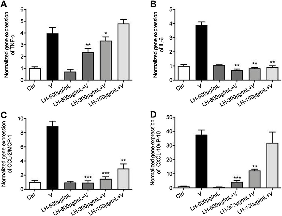 試驗結果表明,連花清瘟在mRNA水平上顯著抑制SARS-CoV-2在Vero E6細胞中的複製,並顯著降低促炎細胞因子(TNF-α,IL-6,CCL-2 / MCP-1和CXCL-10 / IP-10)的產生。此外,連花清瘟處理導致細胞中病毒粒子的顆粒形態異常。