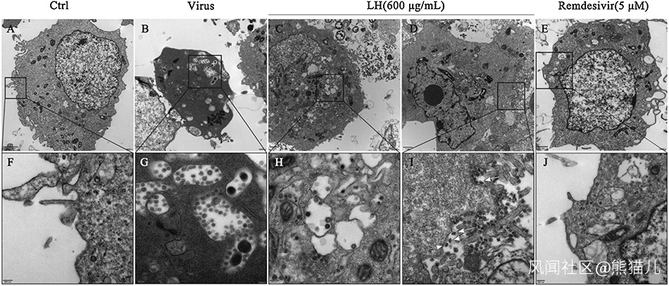 電子顯微鏡下超薄細胞切片。AF為未感染細胞,BG為新冠感染細胞,CDHI為連花清瘟處理細胞,EJ為瑞德西韋處理細胞。