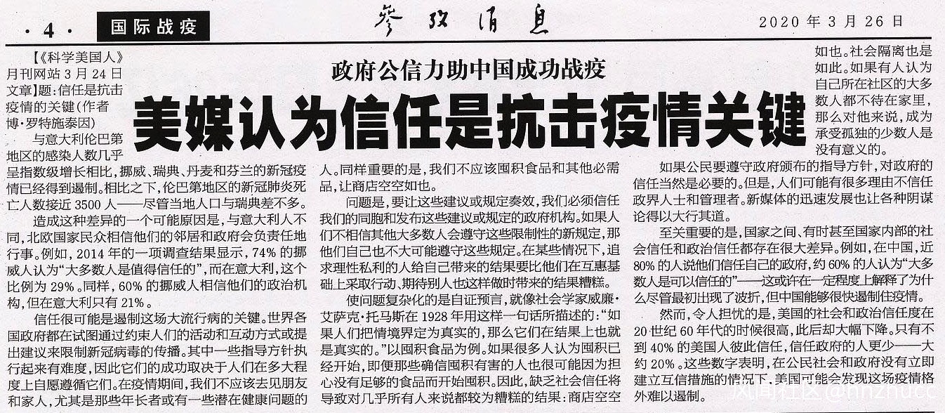 第七,也是最主要的,最大程度地隔離的總體戰略是正確的。美媒曾攻擊中國的封城措施是破壞民主。而如今在疫情攻擊下,很多西方國家都採取類似措施。中國人從一開始就不擔心在一段時間內為防控病毒而犧牲一定的自由。最終中國成功了。(作者為該報國際部副主任愛德華·切斯諾科夫,柳玉鵬譯)