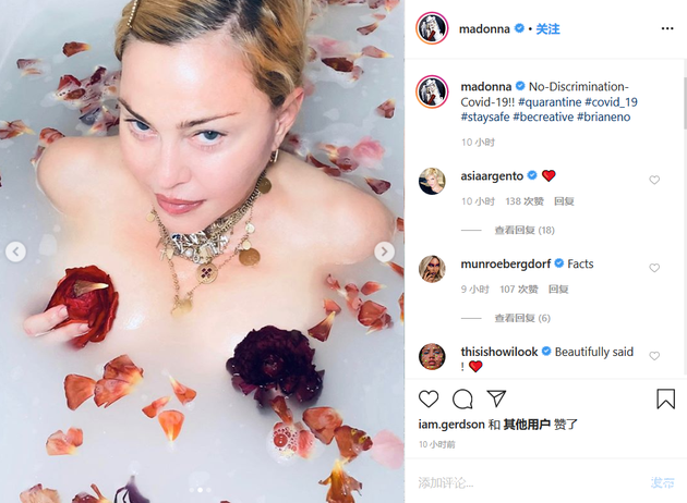麥當娜還貼出了一張照片,並在帖子中寫道:“不歧視——Covid-19!#隔離區#covid 19#staysafe。”