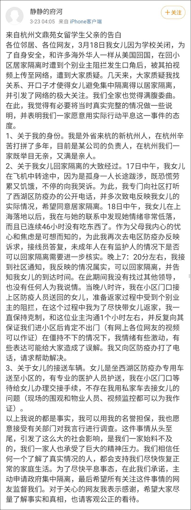 各位鄰居、各位網友,3月18日我女兒因為學校關閉,為了自身安全,和許多海外華人一樣從美國回國,在回小區居家隔離時遭到個別業主阻攔發生口角後,被其拍視頻上傳至網絡,遭到大家質疑。