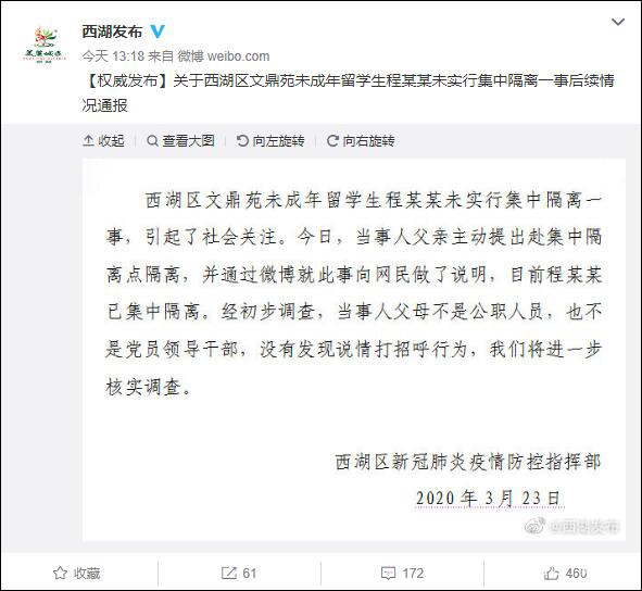 通報稱,西湖區文鼎苑未成年留學生程某某未實行集中隔離一事,引起了社會關注。今日,當事人父親主動提出赴集中隔離點隔離,並通過微博就此事向網民做了説明,目前程某某已集中隔離。經初步調查,當事人父母不是公職人員,也不是黨員領導幹部,沒有發現説情打招呼行為,西湖區將進一步核實調查。