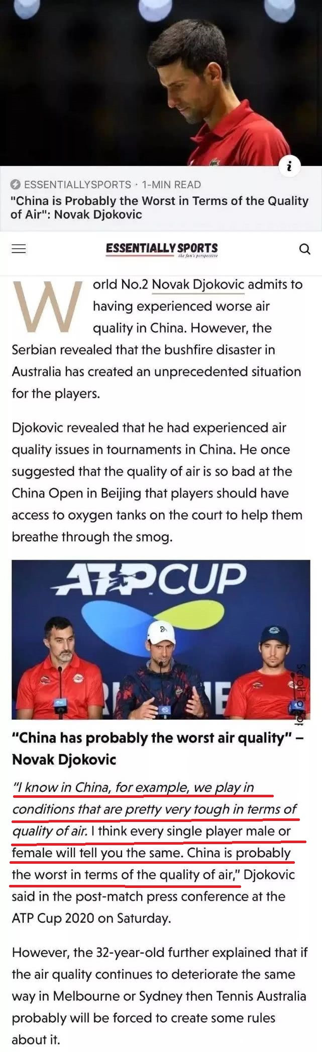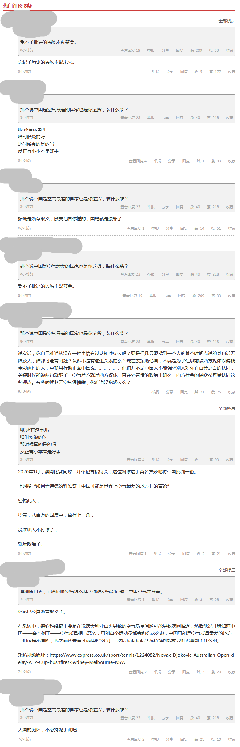 最近德約科維奇“示愛”中國,但部分網友不買賬,原因是該運動員之前吐槽中國空氣。觀網這篇文章下方的評論比較能體現這一情況。