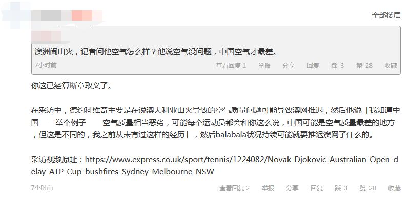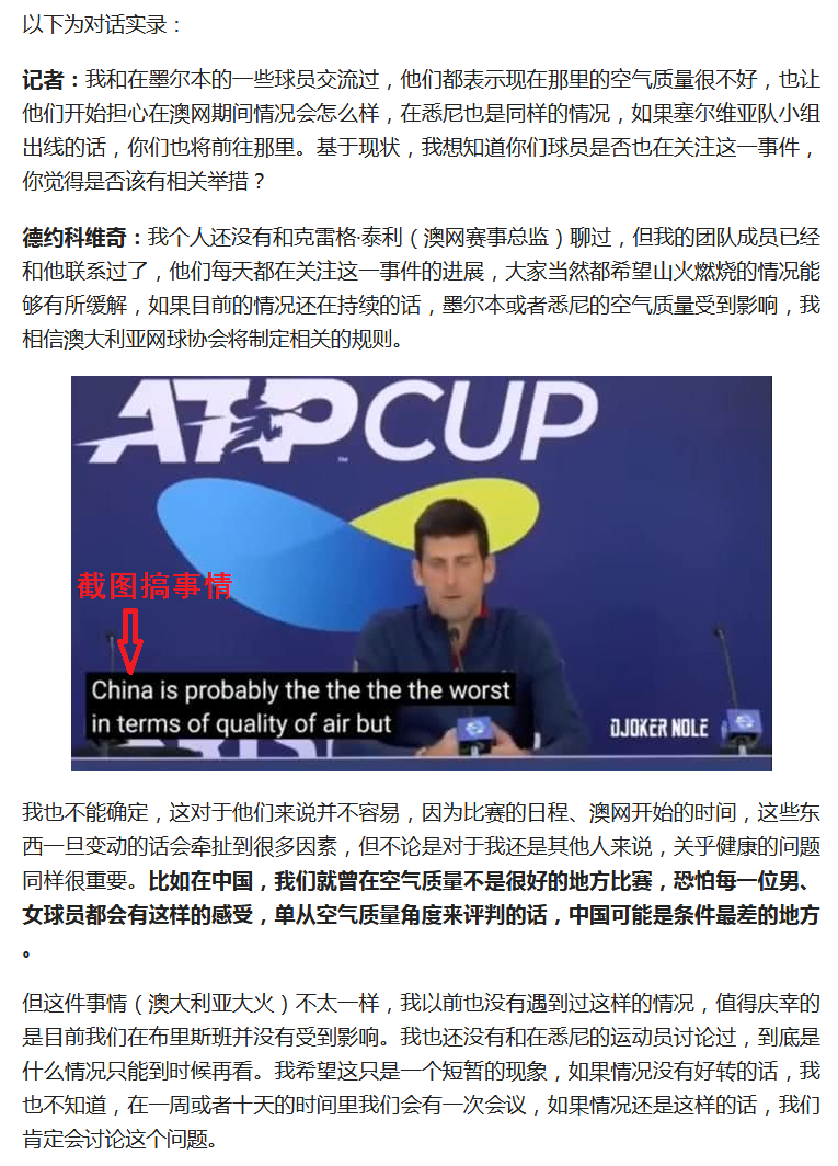 根據這位網友給的連接:https://www.express.co.uk/sport/tennis/1224082/Novak-Djokovic-Australian-Open-delay-ATP-Cup-bushfires-Sydney-Melbourne-NSW(德約科維奇相關言論視頻,英文不錯的可以看看),以及通過搜索所得內容,我較為同意他的説法——網友們斷章取義了——但我覺得主要錯在不良媒體的帶節奏