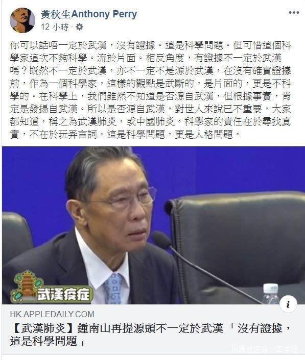 才讀一文寫港星黃秋生申言反對鍾老之此際毋應斷言疫情武漢源頭論。