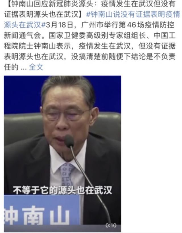 就目下已知之情況,掌握之證據無足佐證病疫源起自何地,若倚疫情首發之武漢以最終屬定之,於治學之嚴謹觀之實可謂言之尚早。此鍾老之言旨。