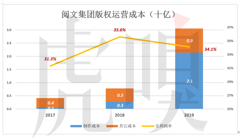 2018年最後的兩個月含新麗傳媒業績,版權運營毛利潤率35.6%;2019年全年含新麗傳媒業績,版權運營毛利潤率34.1%。