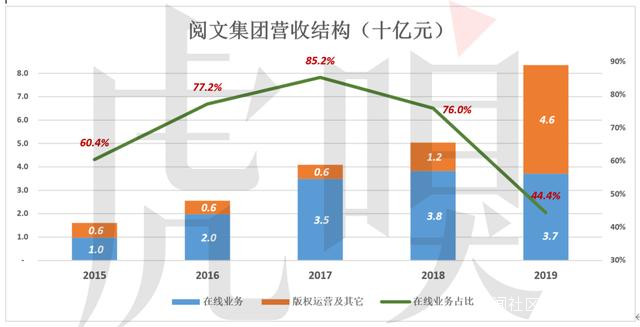 2019年,在線業務收入首次下滑,同比減少3.1%;版權運營及其它收入同比增長283%,達46.4億;在線業務收入佔比跌至44%。