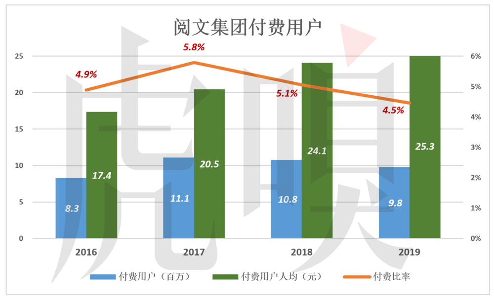 2017年6月,付費用户數衝高到1150萬後開始回落,2019年月均980萬。付費率亦從2017年的5.8%降至2019年的4.5%。好消息是,用户人均月消費從20.5元增至25.3元。