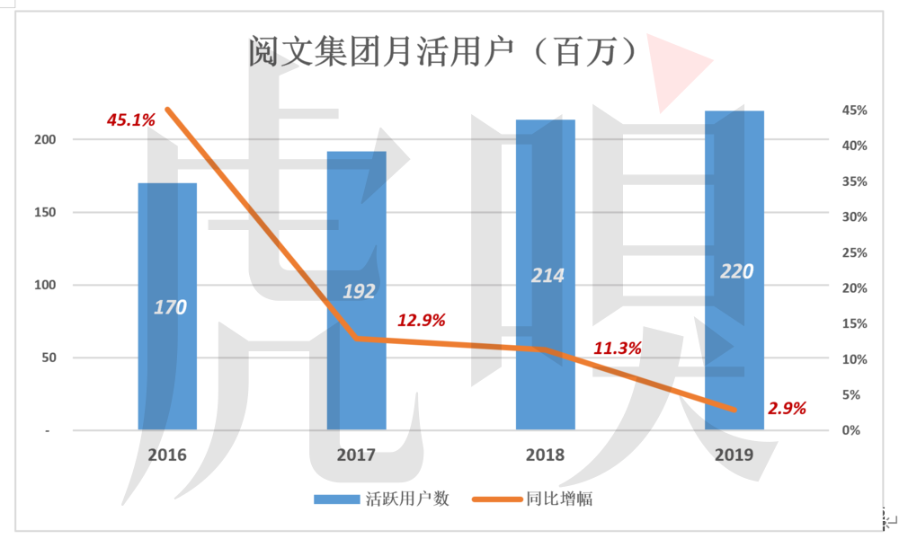 2019年,閲文集團自有平台及騰訊渠道平均月活用户數達2.2億(閲文平台、騰訊渠道大致各佔50%),同比增幅僅2.9%。