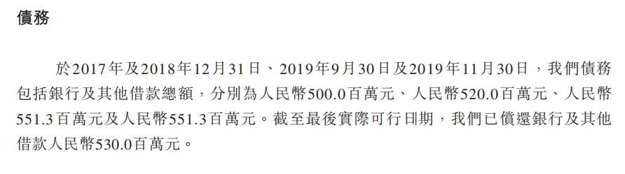 除了經營承受銷售成本高企的壓力,正榮服務的負債率也已經遠超同行業公司,引起市場關注。招股書披露,截至2019年9月末,該公司負債總額達9.18億元,總資產為10.11億元,資產負債率為90.8%,而同行業的其他公司大多保持在80%以下。超出同行10%的資產負債率水平已然達到預警水平。2017-2019年前三季度,正榮服務的債務包括銀行及其他借款總額分別為5億元、5.2億元、5.51億元。