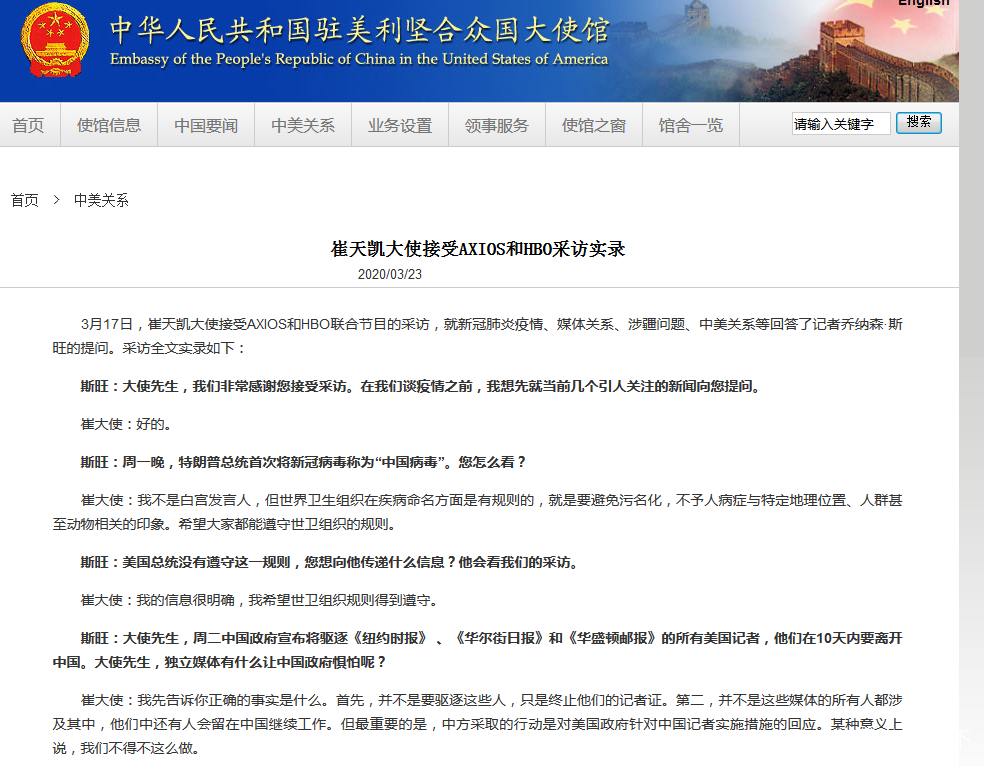 據中國駐美國大使館官網消息,3月17日,崔天凱大使接受AXIOS和HBO聯合節目的採訪,就新冠肺炎疫情等回答了記者喬納森·斯旺的提問。