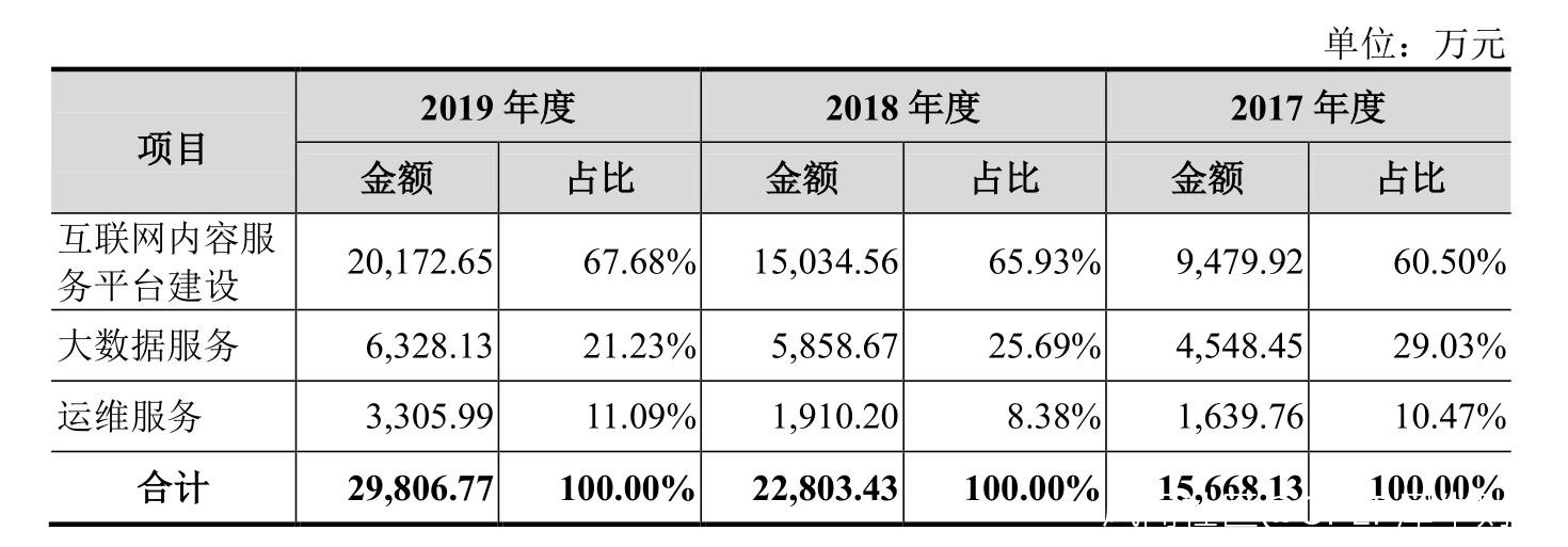 根據招股書,開普雲的營業收入主要來自互聯網內容服務平台建設、大數據服務及運維服務三大業務,2019年三大業務的營收佔比分別為67.68%、21.23%及11.09%。