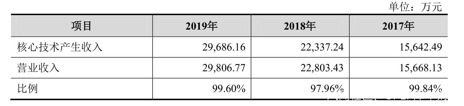在招股書中,開普雲披露2017年至2019年,其核心技術產生收入佔營業收入的比例分別為97.96%、99.84%、99.60%。