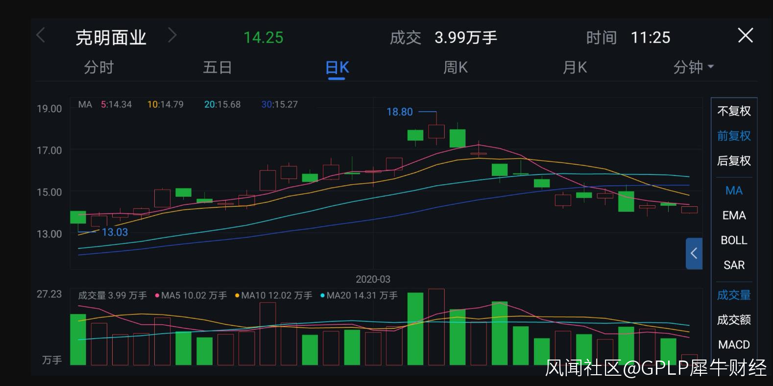 克明面業的股價也是“跌跌不休”。截至3月23日11時25分,克明面業股價為14.25元/股,與3月5日創下的2017年4月以來的最高價18.80元/股相比,已經下降了24.20%。