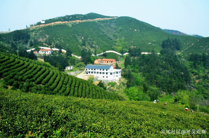 4月,正值春耕和採茶季節,山間梯田裏牛把式在忙着農耕,茶山上身背竹簍採茶姑娘們,揮舞雙手採摘茶樹嫩芽,山間林海、竹海、花海、水庫、小溪彙集在一起,站在高高的山崗上放眼遠眺,讓人無不讚嘆:美哉大別山,美哉固始。